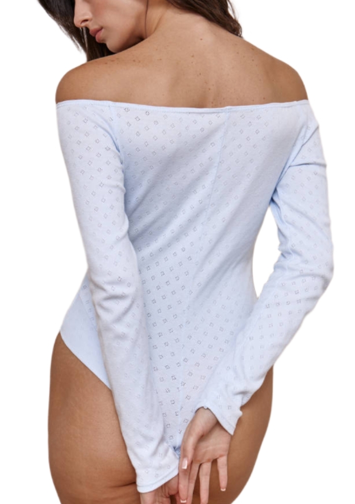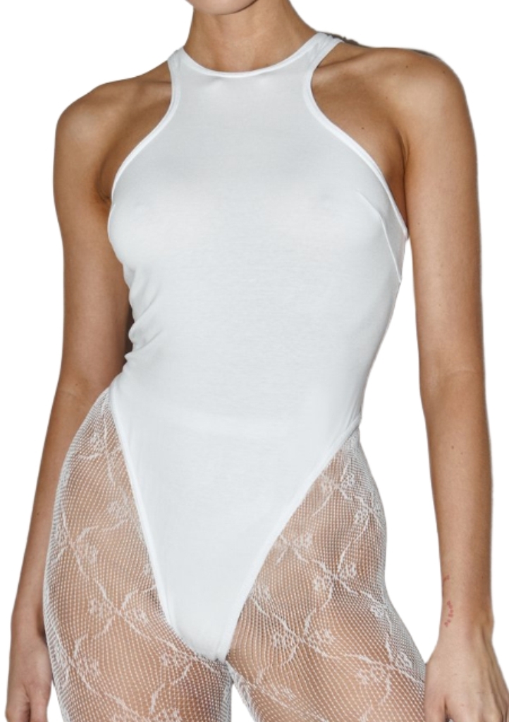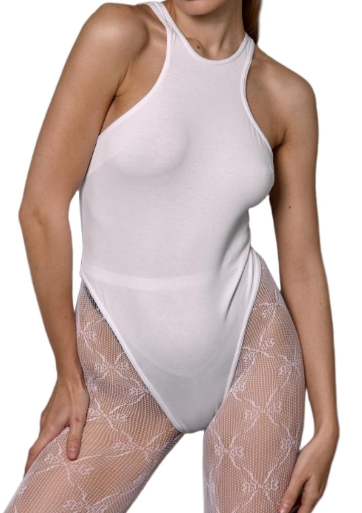 Перед состоит из 2 частей: чашка с вытачкой и нижняя часть. Горловина переда овальная глубокая. Спинка цельная, низ — стринги. Горловина спинки овальная, глубже, чем на переде. Срезы ножек открытые, завышенные. Боди без застёжки.