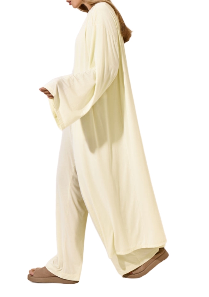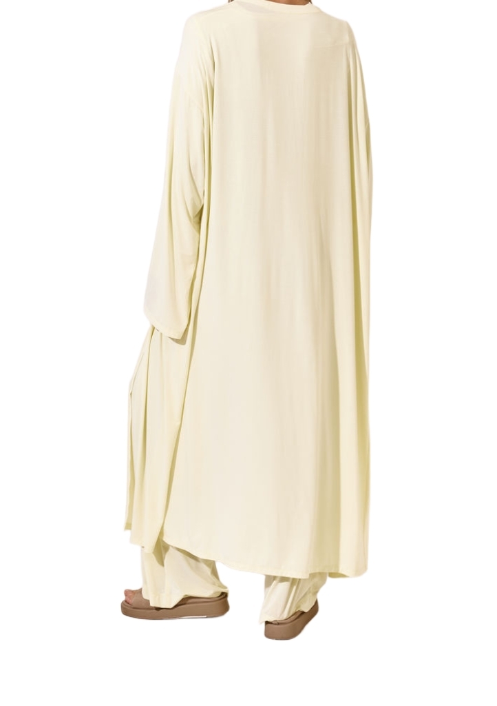 Накидка-халат женская свободного силуэта длиной выше щиколодки. Горловина спинки обработана обачкой. Рукав рубашечный длинный расклешённый к низу.