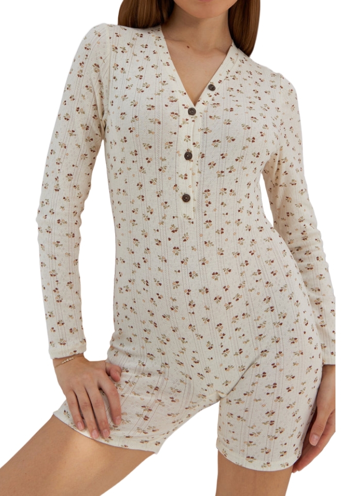Комбинезон женский, прилегающего силуэта. Перед с планкой на 4 пуговицы. Длина комбинезона немного выше середины бедра на 4 см. Рукав втачной длинный. Комбинезон можно носить в качестве домашней одежды, а также в качестве одежды в летний сезон.