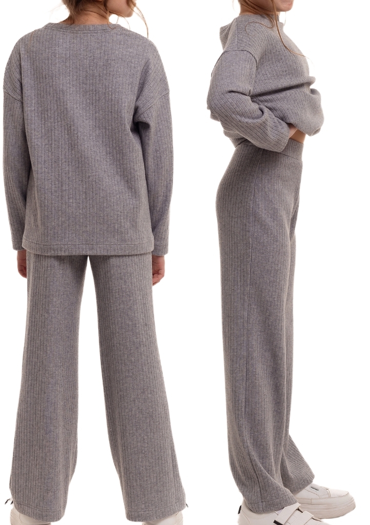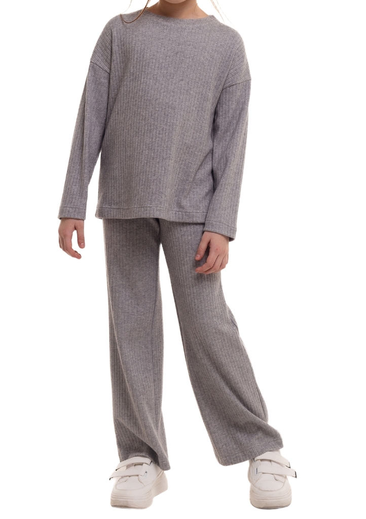 Трикотажные брюки среднего объема, слегка расширенные к низу. Пояс — притачной на резинке.
